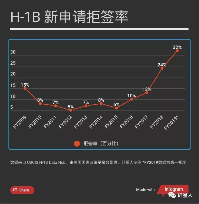 因为这一解读和执行的问题,H-1B的拒签率在特朗普上台后有了显著提升: