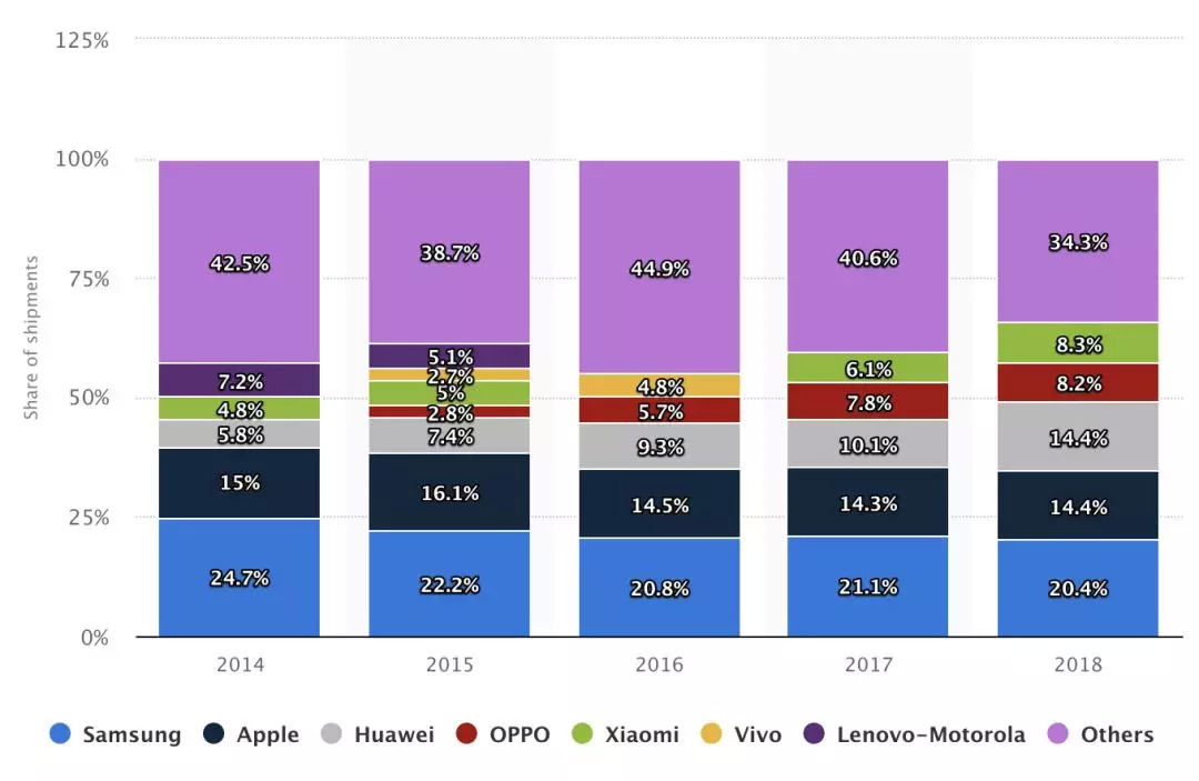 联想手机业务发展得不怎么顺利,其提出的解决方案,与转型互联网、发力PC一样简单粗暴,一个字,买买买。2014年,联想收购Moto,以总计7.2%的市占率一跃成为当年全球第三大手机品牌,相比之下华为市占率仅4.8%,如日中天的小米为5.8%。