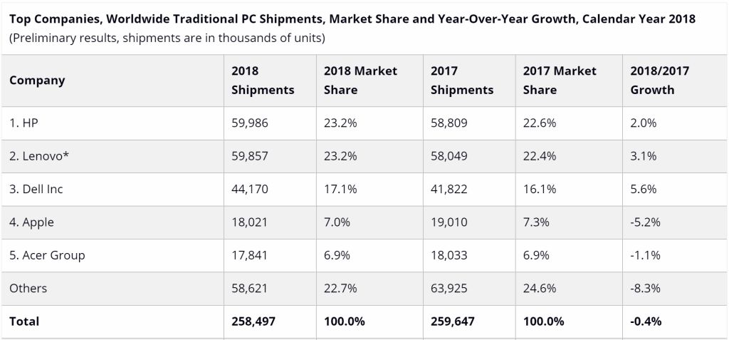 从营收上看,联想仍然是一家PC厂商。据IDC数据,2018年联想和惠普两者市场份额相当,不过考虑到联想曾在2018年6月收购富士通的PC业务,其市占率相比惠普并不具备优势。