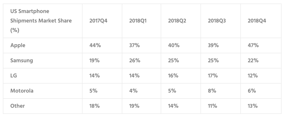 这是一段极具误导性的数据分析。联想只是给出了一个大概的数字,却从来没有公开其市长占有率的具体数值。根据Counterpoint提供的数据,2017Q4--2018Q4,Moto在美国市场的市占率稳定在5%左右,仅在2018年Q3达到8%,之后回落。