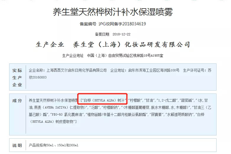 ▍桦树汁喷雾配方表中排名第一位的是“白桦树汁”(截自国家药监局官网)