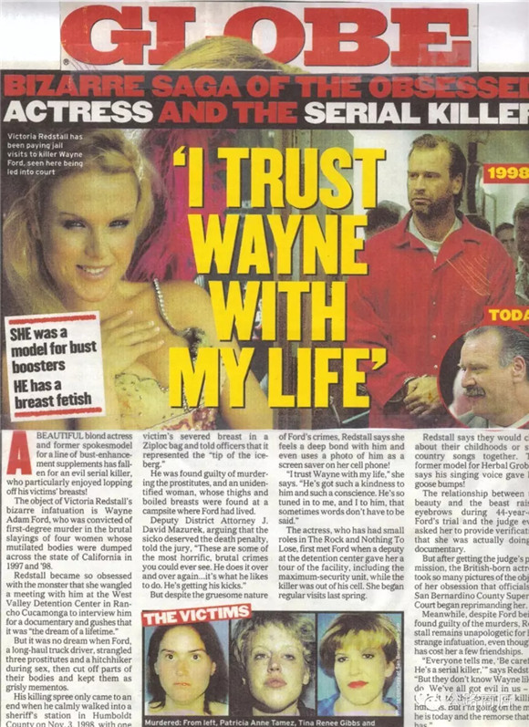 如果非要评分的话,在监狱果这个古怪圈子里,Wade Ford和他的姑娘们可以拿个“B++”,作为一名连环杀手,Ford专挑妓女下手,在虐杀她们之后还会肢解她们的尸体。Ford还将其中一名受害者的乳房寄给了警察局。胸部丰满的VictoriaRedstall以前是一名英国女演员,曾经为丰胸广告做过代言人。在Ford的庭审过程中,Victoria想方设法认识了他,并经常去监狱探视,他们一起唱歌并谈论各自的童年。Victoria还将Ford的照片设置为手机屏保。她说,她会用全部生命去信任这个男人。讽刺的是,2011年,在认识Ford五年以后,Victoria参演了一部名为“如何挑个姑娘”的电影……