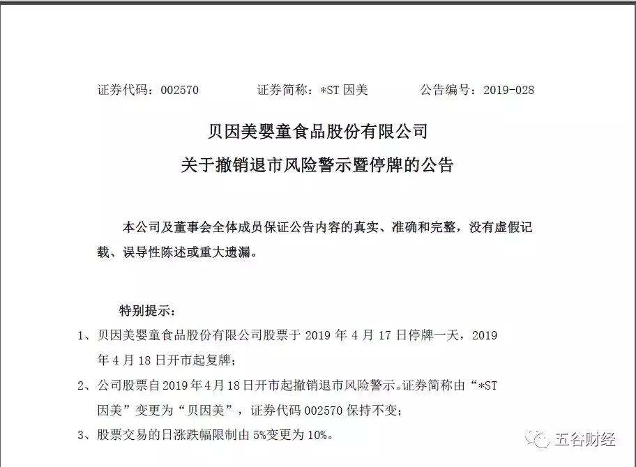 4月17日,*ST因美发布了《关于撤销退市风险警示暨停牌的公告》,股票于2019年4月17日停牌一天,2019年4月18日开市起复牌;股票自2019年4月18日开市起撤销退市风险警示。