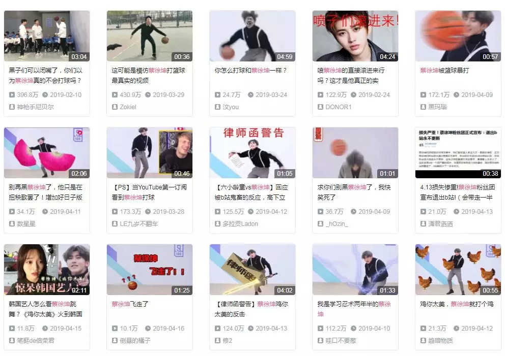 特别是蔡徐坤打篮球的视频,在B站上已经完全被各种鬼畜剪辑,现在打开B站搜索“蔡徐坤”出现的都是恶搞视频。
