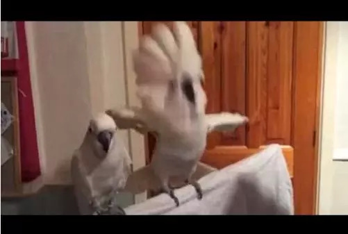 (生性热情的那只鹦鹉按对面主人吉他的节奏大肆甩头,图片截自微博)