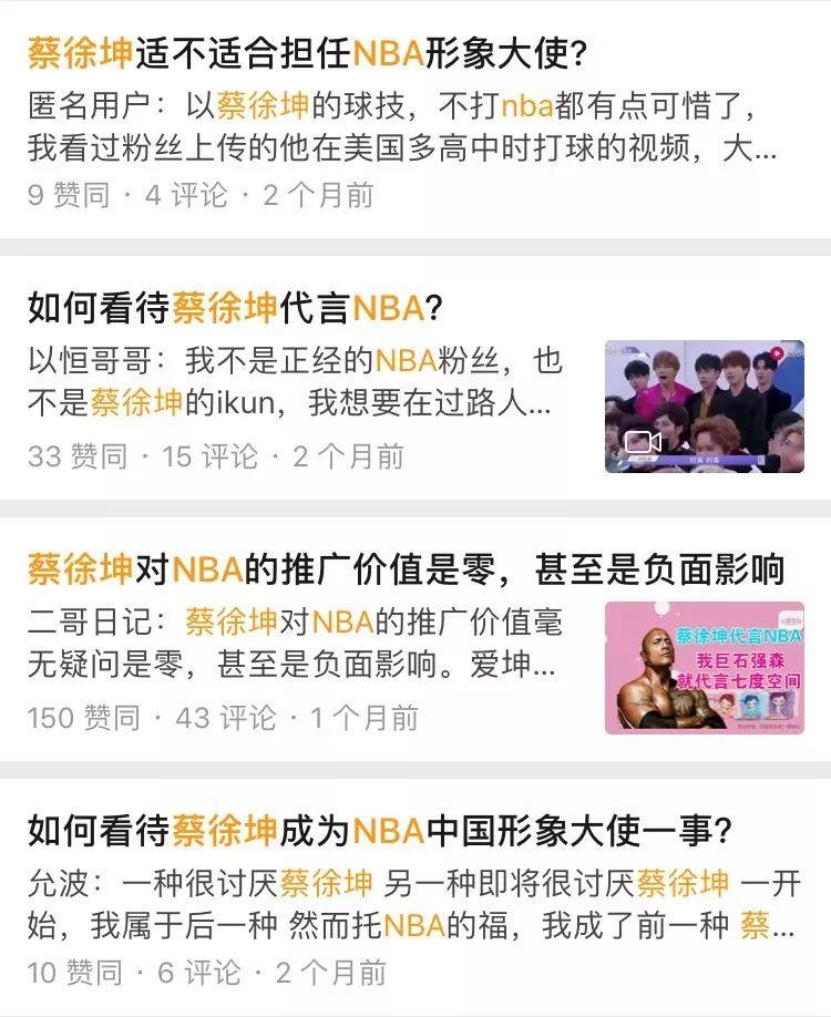 不同于粉丝群体这此消息的庆祝转发,在以体育迷等男性用户为主的虎扑上,蔡徐坤引发了一种愤怒。蔡徐坤自称篮球爱好者,并在留美时期参与篮球校队,虎扑上迅速对其进行了一些列考古,他的打扮、他的身材、他的行为举止都成了众矢之的,男性群体并不认可蔡徐坤可以作为NBA的形象大使,并对他此前在《偶像有新番》节目中的一段篮球舞蹈秀进行了嘲讽。