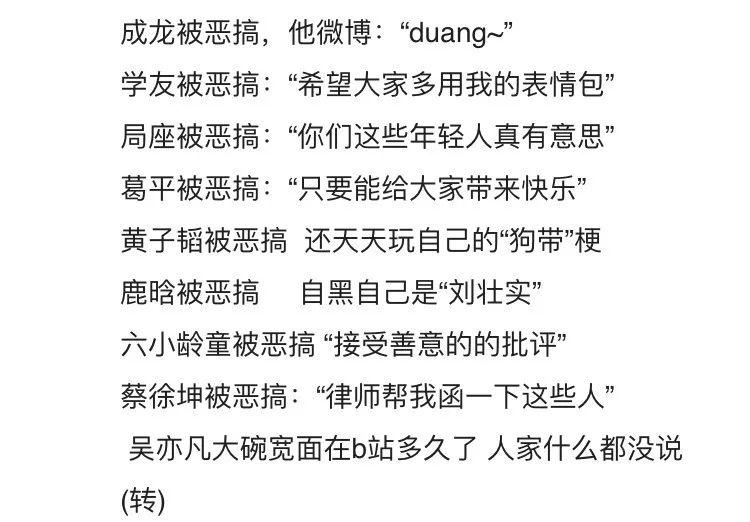 互联网环境下,万物皆可娱乐,万物皆可流量,媒体总是不吝啬用的以“娱乐至死”这类词来形容这种狂欢状态,而这种状态下,明星艺人的公关准则在发生变化,面对恶搞,与其愤慨激昂的进行反驳与澄清,不如无伤大雅的一笑而过。蔡徐坤工作室对B站发送律师函,这种行为在B战部分用户与路人看来是反面教材,正面碰撞,显得小题大做。倾向B站与鬼畜的网友整理出了成龙、吴亦凡、局座等一系列被鬼畜名人的反应,“全区衬托”显得蔡徐坤这次处理并不妥当。
