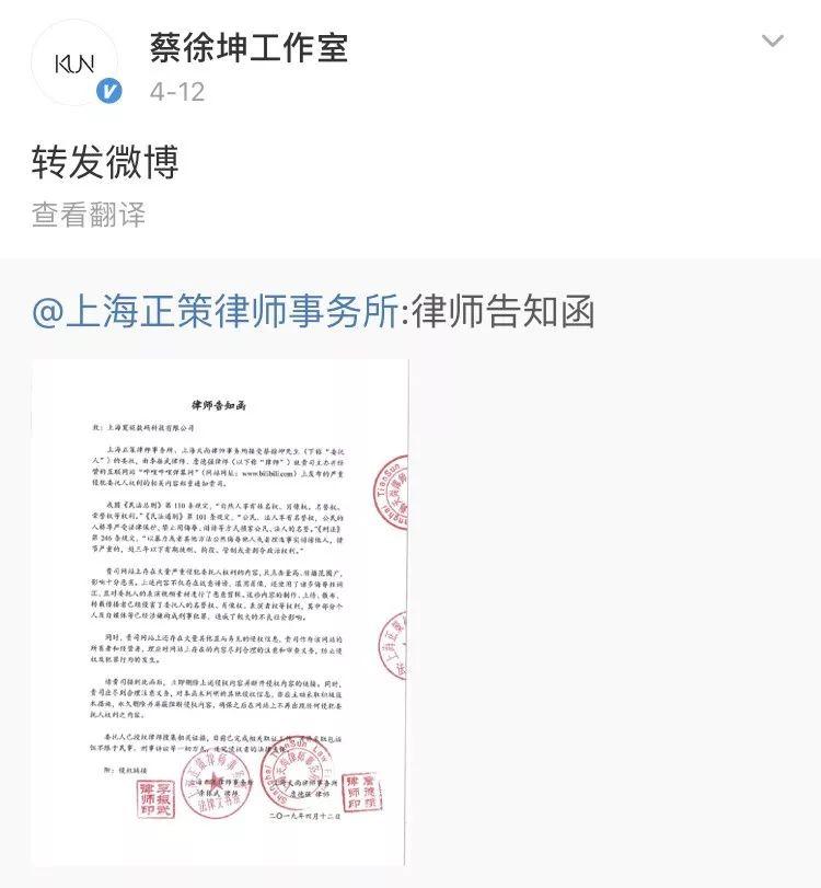 这一天,蔡徐坤工作室转发了上海政策律师事务所一条微博,因B站上出现了大量蔡徐坤的恶意剪辑内容,侵犯了蔡徐坤的名誉权、肖像权、表演者权等权利,工作室一纸律师告知函警告,将蔡徐坤与B站鬼畜区的“一段孽缘”拖拉至大众视野。随后#蔡徐坤告B站”等话题迅速登上微博热搜。