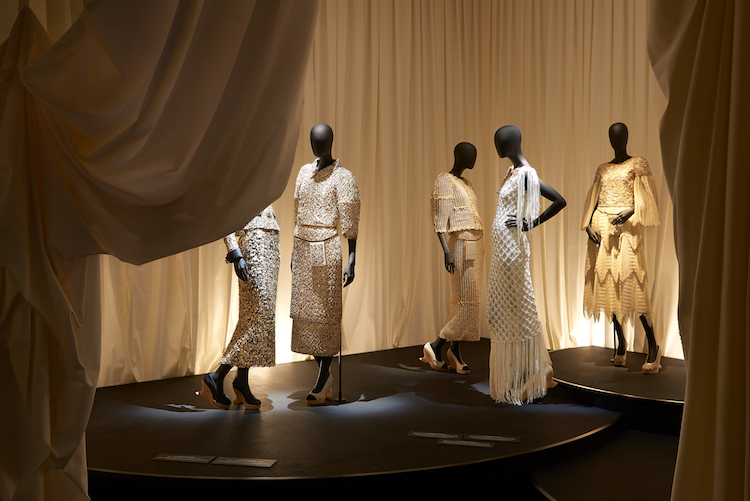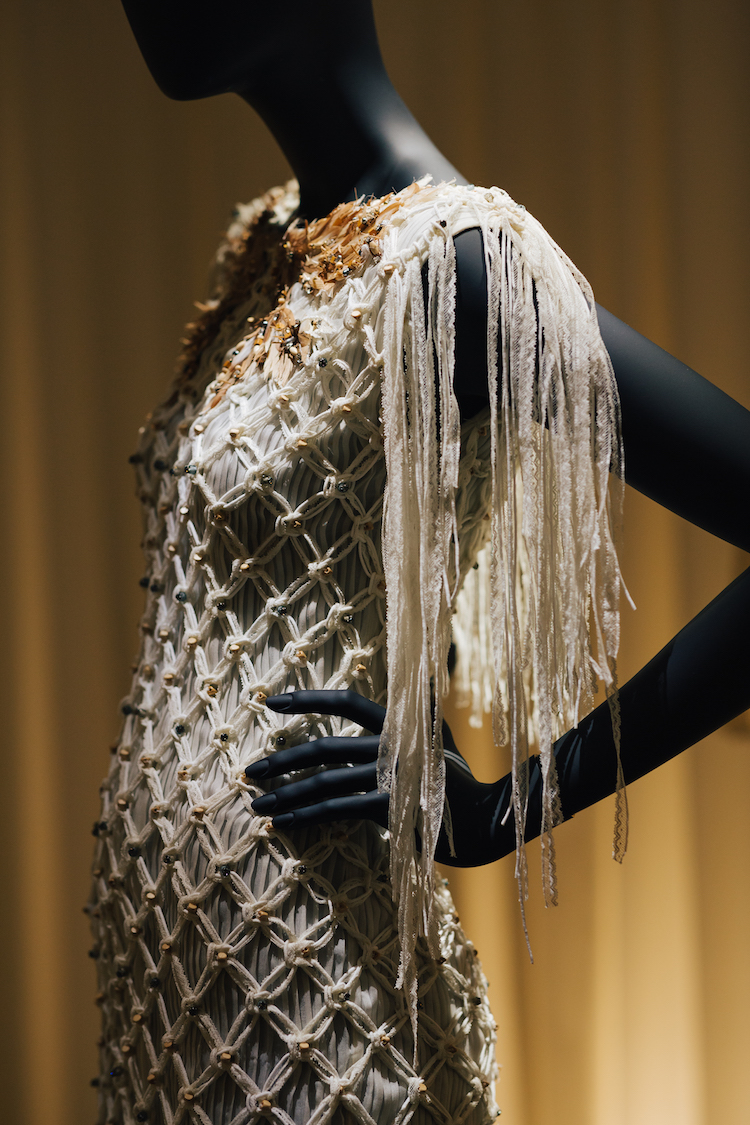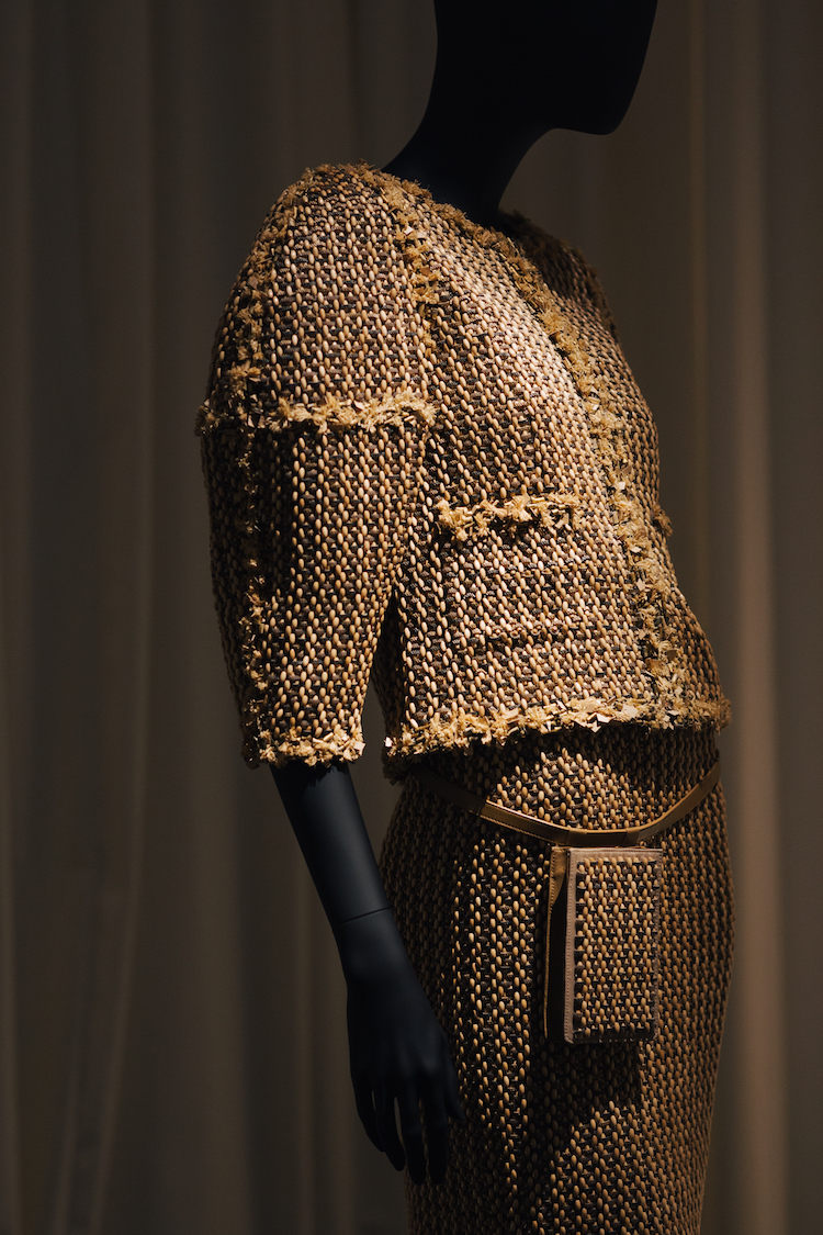 其中,在展示高级定制服的房间,展示了来自2013年春夏至2018年秋冬期间,卡尔·拉格斐所创所的6个香奈儿高级定制服系列,共有33款设计。这些高级定制服使用了7种鲜少用在服装上的材料,比如木材、潜水服面料以及3D打印材料等。房间内的小展区被制作高级定制服的布料间隔开,播放的背景音还原了地铁、餐厅等各种场景,以寓意香奈儿的高级定制服可以在任何场合穿着——而不仅仅是衣香鬓影的社交场合。