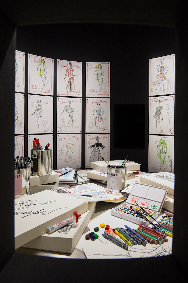卡尔·拉格斐为香奈儿工作了36年,今年2月他的去世,为这段在当下时装界已难得一见的宾主情谊划上了句点。香奈儿把拉格斐工作台的一部分搬到了这个房间的中央,上面放满了他所画的草稿、用过的彩笔和颜料。
