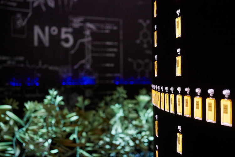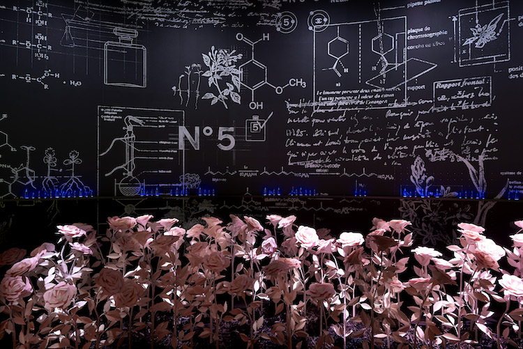 展示香奈儿N°5香水的房间,可能是本次展览中最适合打卡拍照的房间。和只可远观的高级定制服,以及和在玻璃展柜里的高级珠宝不同,N°5香水配方中所用到的主要花卉在这个房间里以手工艺术纸花的形式重现。部分花卉还安装了机关,可以上下开合。房间的立柱上安放了1400瓶真的香奈儿N°5香水,墙面则绘满了香水的化学公式。