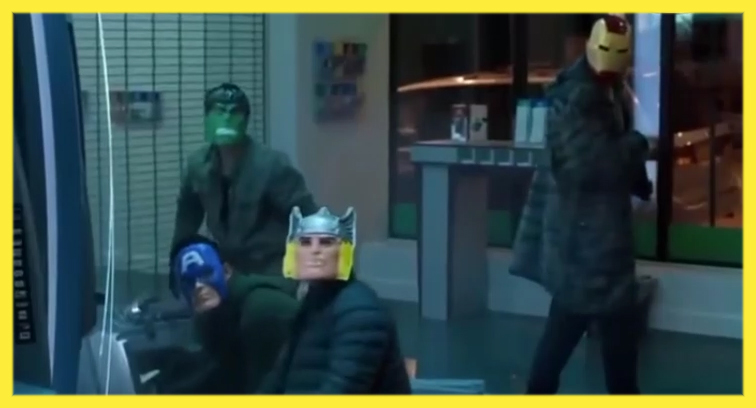 然而抢银行的劫匪一抬头,竟然带着复联面具...这个现场根本帅不动啊。▼