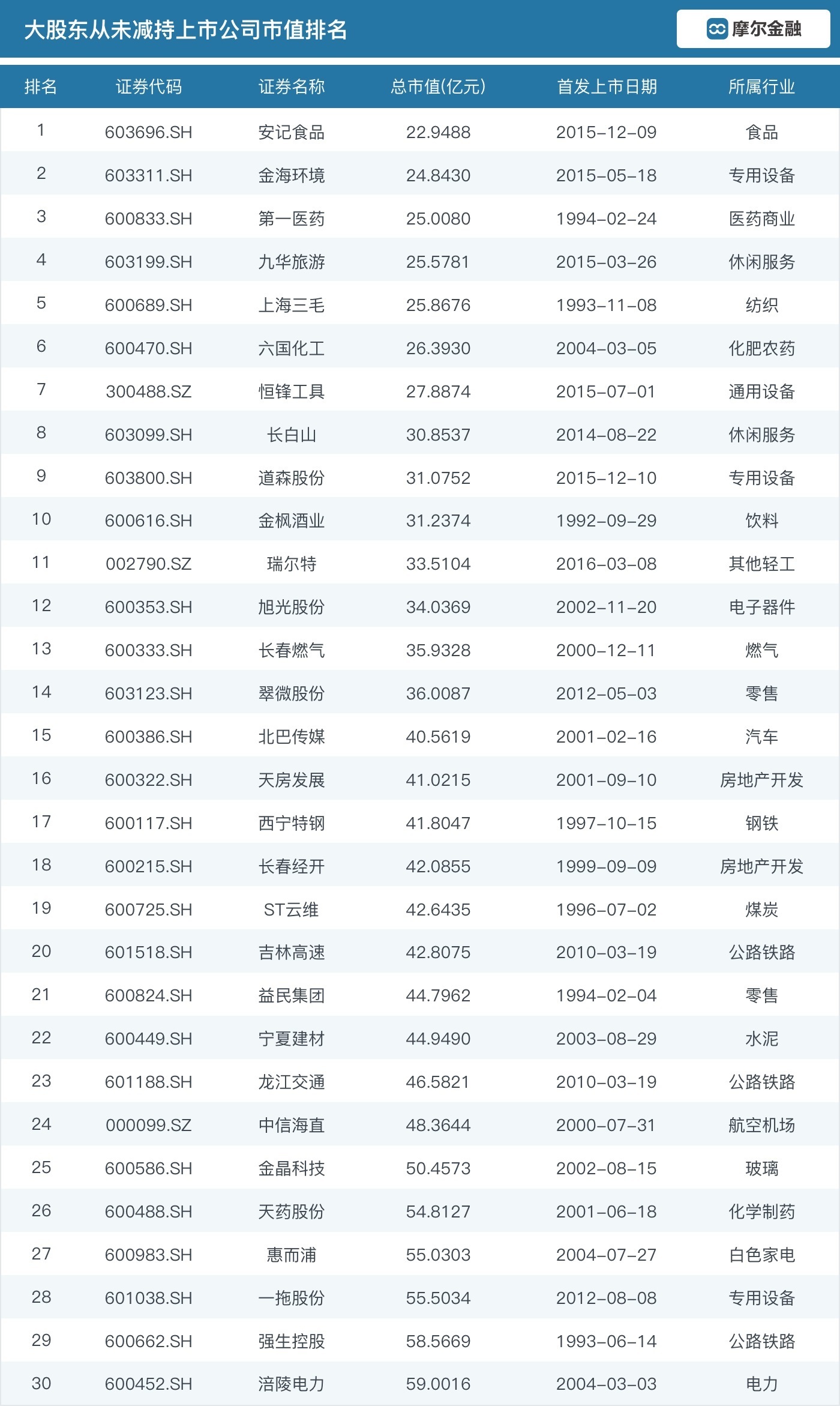 看过了市值靠前的股票,我们为大家整理了从未减持小市值的TOP30,虽然这些股票不能确定后期一定会走成大牛股,但是关键股东不减持还是可以作为一定的参考的,其中,股价一度破发的安记食品仅22.94亿,创投新秀的上海三毛25.86亿等,具体的大家请看下面的榜单。