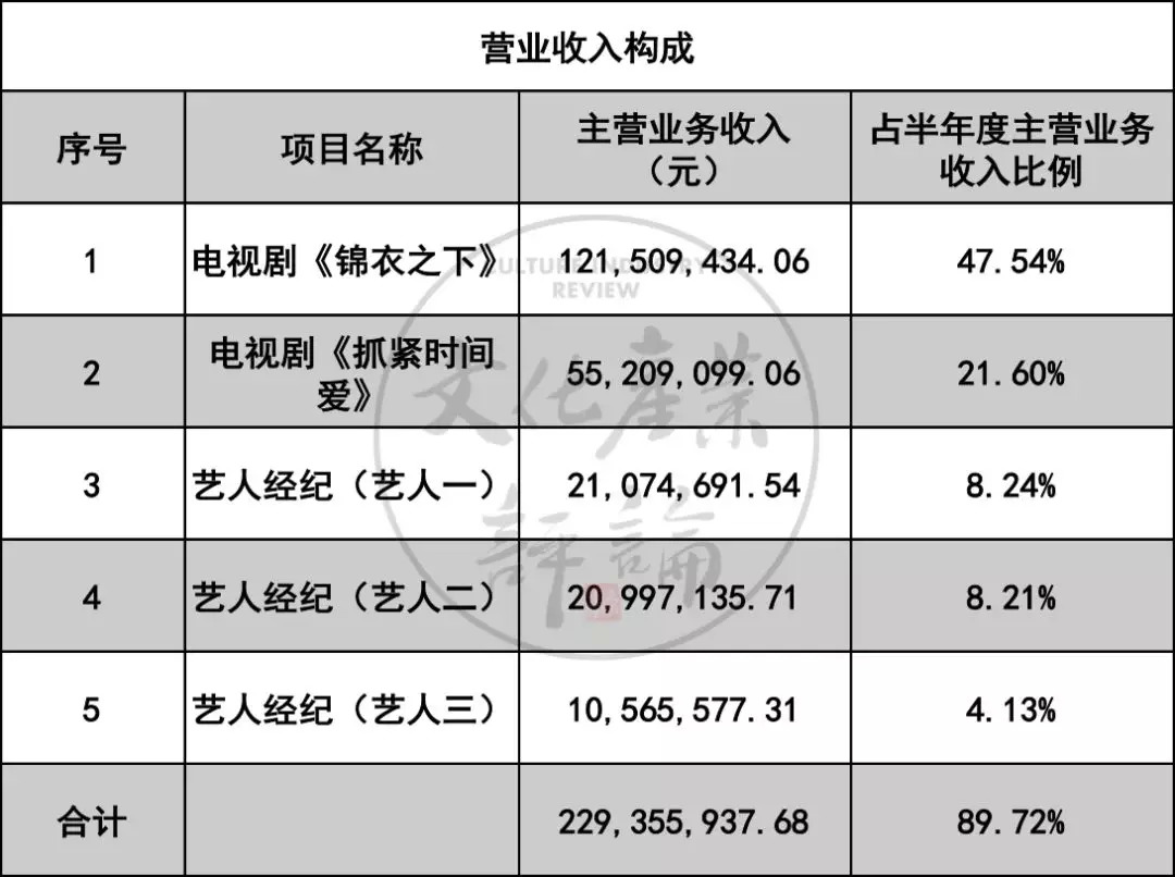 从数据对比来看,有几家公司如开心麻花、欢瑞世纪连续两年来一直维持高收入,这得益于两家公司生产出了受欢迎的影视作品,以及旗下艺人超强的吸金能力。如欢瑞世纪2018年上半年的收入,《锦衣之上》和《抓紧时间爱》两部电视剧占了一大部分,其次就是几位一线艺人经纪收入。