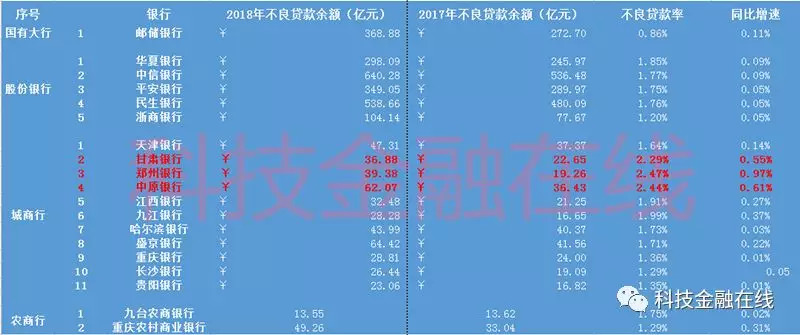 其中,在19家不良率同比上升的银行中,有1家国有大行——邮储银行;5家股份银行,分别为华夏银行、中信银行、民生银行、平安银行、浙商银行;11家城商行,分别是天津银行、甘肃银行、郑州银行、中原银行、江西银行、九江银行、哈尔滨银行、盛京银行、重庆银行、长沙银行以及贵阳银行;以及2家农商行,九台农商银行和重庆农商银行。