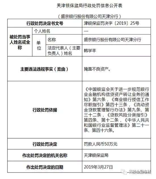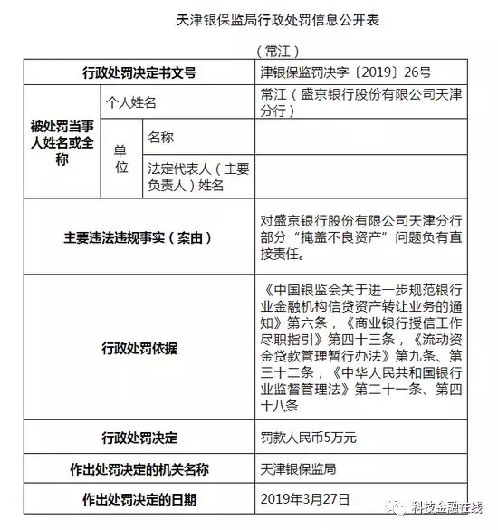 4月12日,天津银保监局一连开出6张罚单,其中4张罚单的违法违规案由均指向商业银行掩盖资产质量的问题。其中,盛京银行天津分行因掩盖不良资产被处以罚款50万元,该行1名相关责任人被罚款5万元。