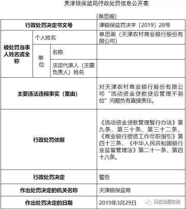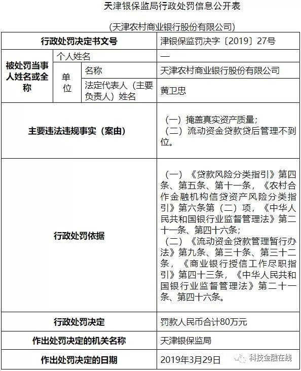 同样是4月12日,天津农商行被天津银保监局罚款80万元,其中一项违规案由包括掩盖真实资产质量,该行1名相关责任人被给予警告处分。