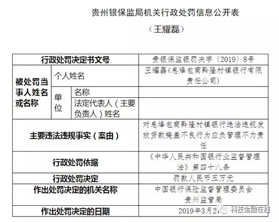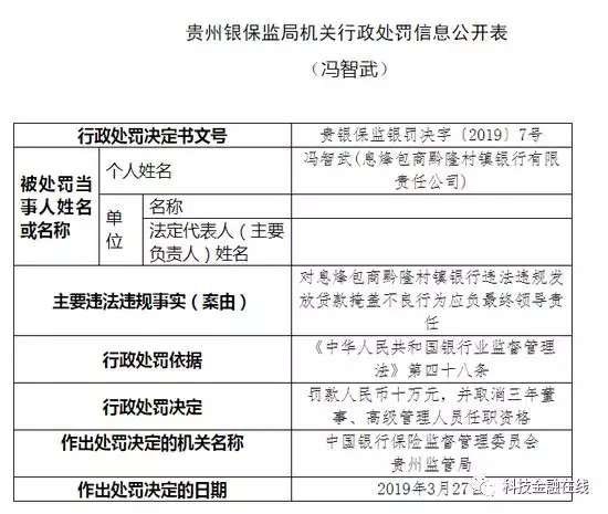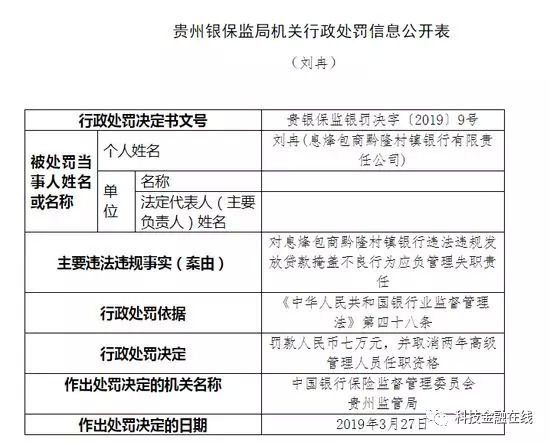 此外,同日,息烽包商黔隆村镇银行的三名责任人因对该行“违法违规发放贷款掩盖不良行为”分别应负“管理失职责任”、“管理不力责任”、“最终领导责任”而被分别处以罚款7万元、5万元、10万元。其中,一名责任人被取消两年高级管理人员任职资格,还有一名责任人被取消三年董事、高级管理人员任职资格。