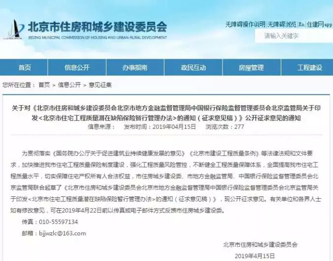 近日,北京市住建委、市地方金融监督管理局、中国银行保险监督管理委员会北京监管局三个部门联合制订的《北京市住宅工程质量潜在缺陷保险暂行管理办法》公开征求意见。按照征求意见稿,北京新建住宅将投保工程质量潜在缺陷保险。