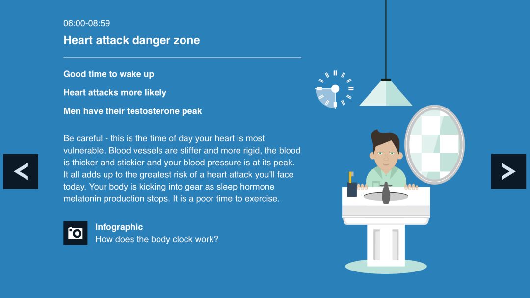 06:00am-08:59am,褪黑素分泌停止,是起床的好时机。但此刻是心脏一天中最脆弱的时候,血压达到峰值,不适合立即运动。