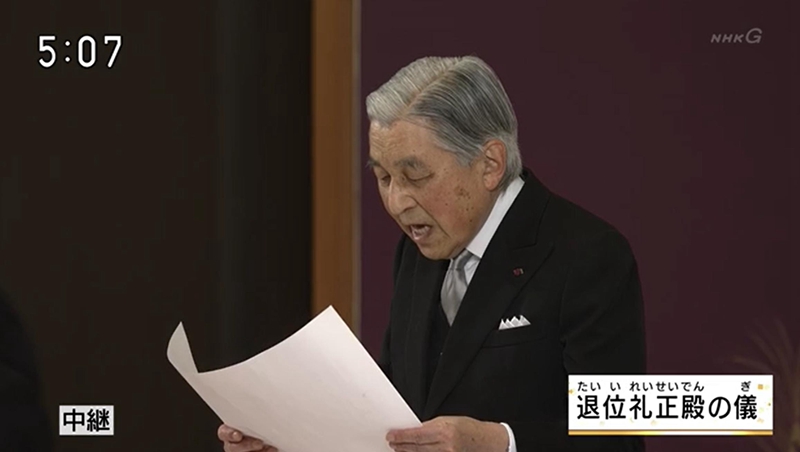 当地时间下午5点,在宫殿“松之间”举行的正殿之仪上,首相安倍晋三代表日本国民致辞,同时明仁发表了在位时的最后讲话。