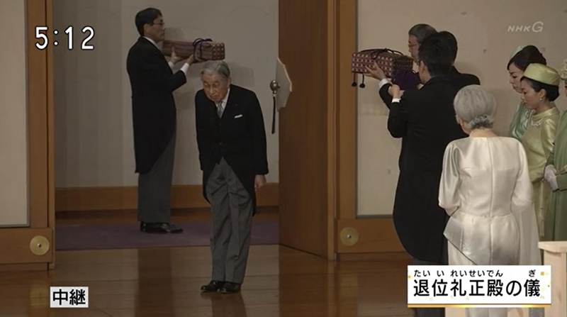 而明仁在结束正殿之仪后将在宫殿和御所内举行接受皇族及宫内厅职员问候的活动。晚上7点半左右,明仁作为天皇的所有活动结束,他可以静静等待退位时刻的到来。