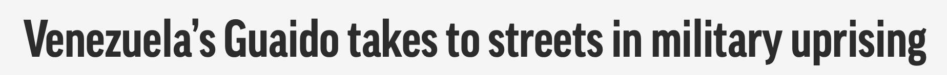 【委内瑞拉反对派领导人瓜伊多发动军事政变】委内瑞拉反对派领导人瓜伊多周二早上带领一小股全副武装的军人发动军事政变,试图推翻总统马杜罗。双方支持者在首都加拉加斯的肢体冲突中致使至少71人受伤。