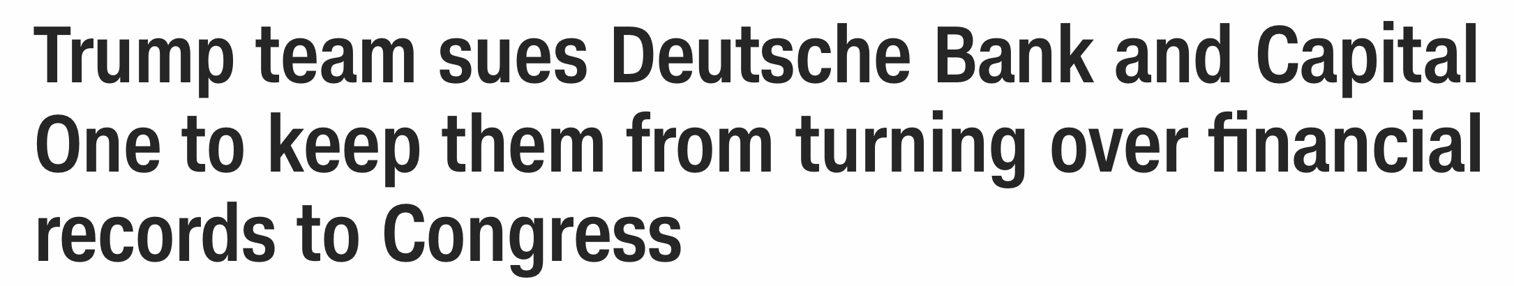 【特朗普起诉德银和Capital One,欲阻止银行向国会提交财务记录】美国总统特朗普、他的三个子女以及他的公司起诉两家银行,试图阻止银行向国会委员会提交财务记录,国会委员会之前发出传票,要求银行提供信息。