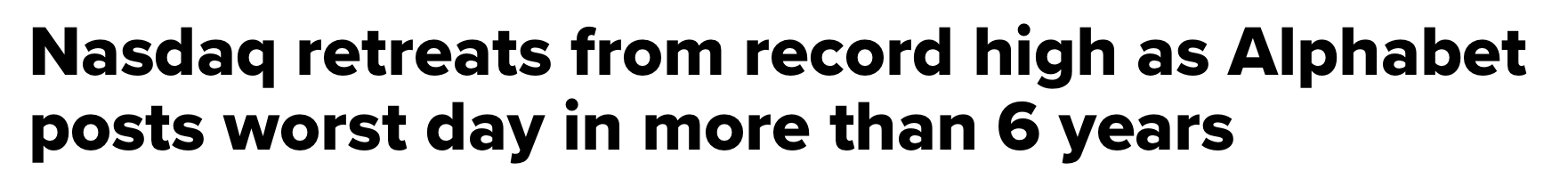 【纳斯达克指数从历史新高回落】美国纳斯达克指数周二下跌0.7%,谷歌母公司Alphabet公布第一财季收入低于预期,股价暴跌。周一纳指刚刚创下历史新高。