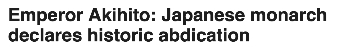 平成天皇今年85岁,他在表示由于年事已高和健康状况下降,感到无法履行天皇职责后,获准退位。他是200多年来首位在生前退位的天皇。