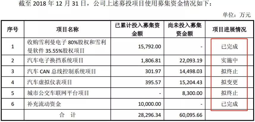 目前,公司前次募资项目中除补充流动资金外的多数项目已被终止或变更。其中,拟终止的募投项目汽车CAN总线控制系统项目和城市公交车联网平台项目截至2018年12月31日累计投入的募资金额为301.97 万元,远低于前期拟投入的2.31亿元。