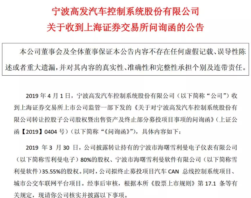 而上述情况也引起了监管部门的注意。2019年4月1日上交所对公司下发问询,要求公司核实并披露股权出售及进行终止募投项目等事项。