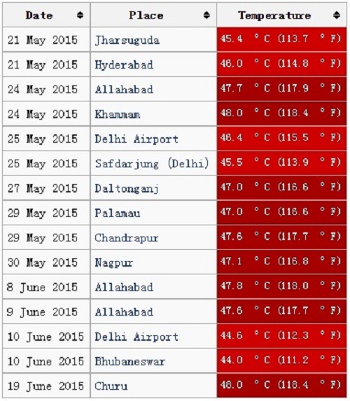 自1990年以来,在印度,已有超过20000人死于极热天气。上一次最严重的酷暑天气出现在1995年,当时连续的热浪夺走了1677条生命,2011年的数字为793人,2012年为1247人,2013年的数字为1216人。