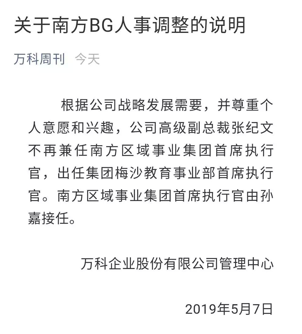 昨天一早,万科忽然官宣人事变动:南方区域区首张纪文卸任,转任万科梅沙教育集团CEO,而万科集团CFO孙嘉接任南方区域区首。