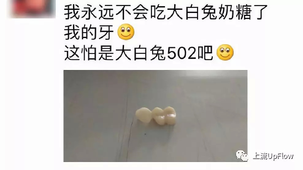 ▲大白兔奶糖变“大白兔502”,把烤瓷牙粘了下来 | 图片来源:微博@朋友圈那点事儿