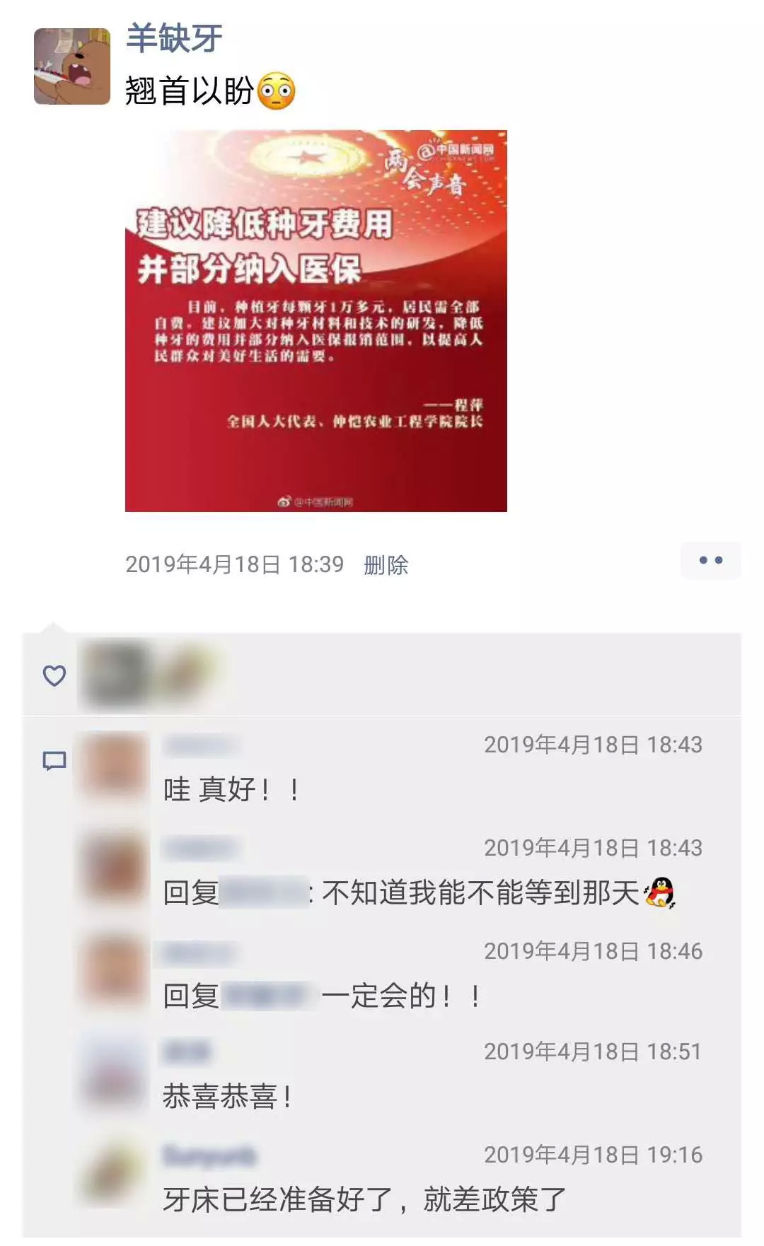 2019年全国两会,有人大代表提出《关于提高口腔基本医疗保障水平的建议》,建议降低种牙费用并部分纳入医保。