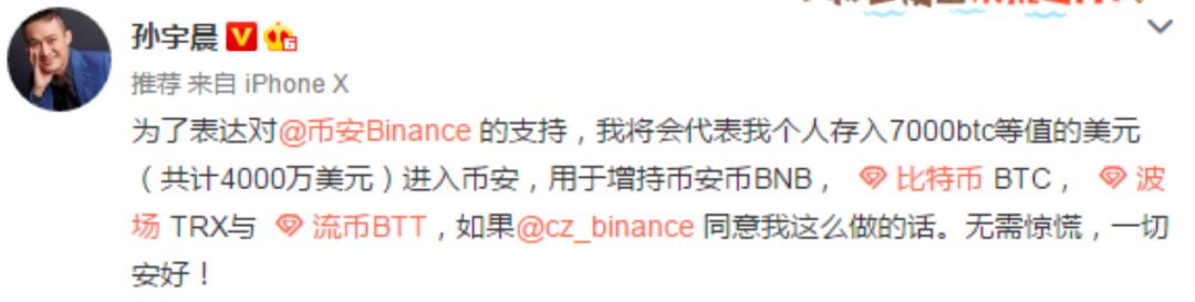 营销高手孙大师便在社交平台上表示,无须惊慌,一切安好。为了表达对币安的支持,如果赵长鹏同意的话,我将会代表我个人将价值4000万USDT的7000BTC存入币安。