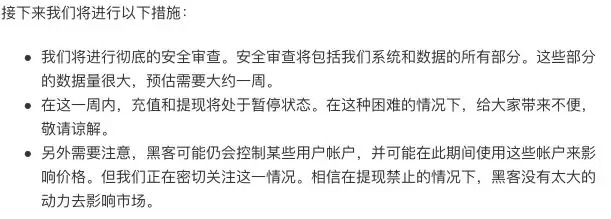 此外,币安还给出了补救措施表示,将用大约一周的时间进行彻底的安全审查,并暂停一周左右的充值和提现。