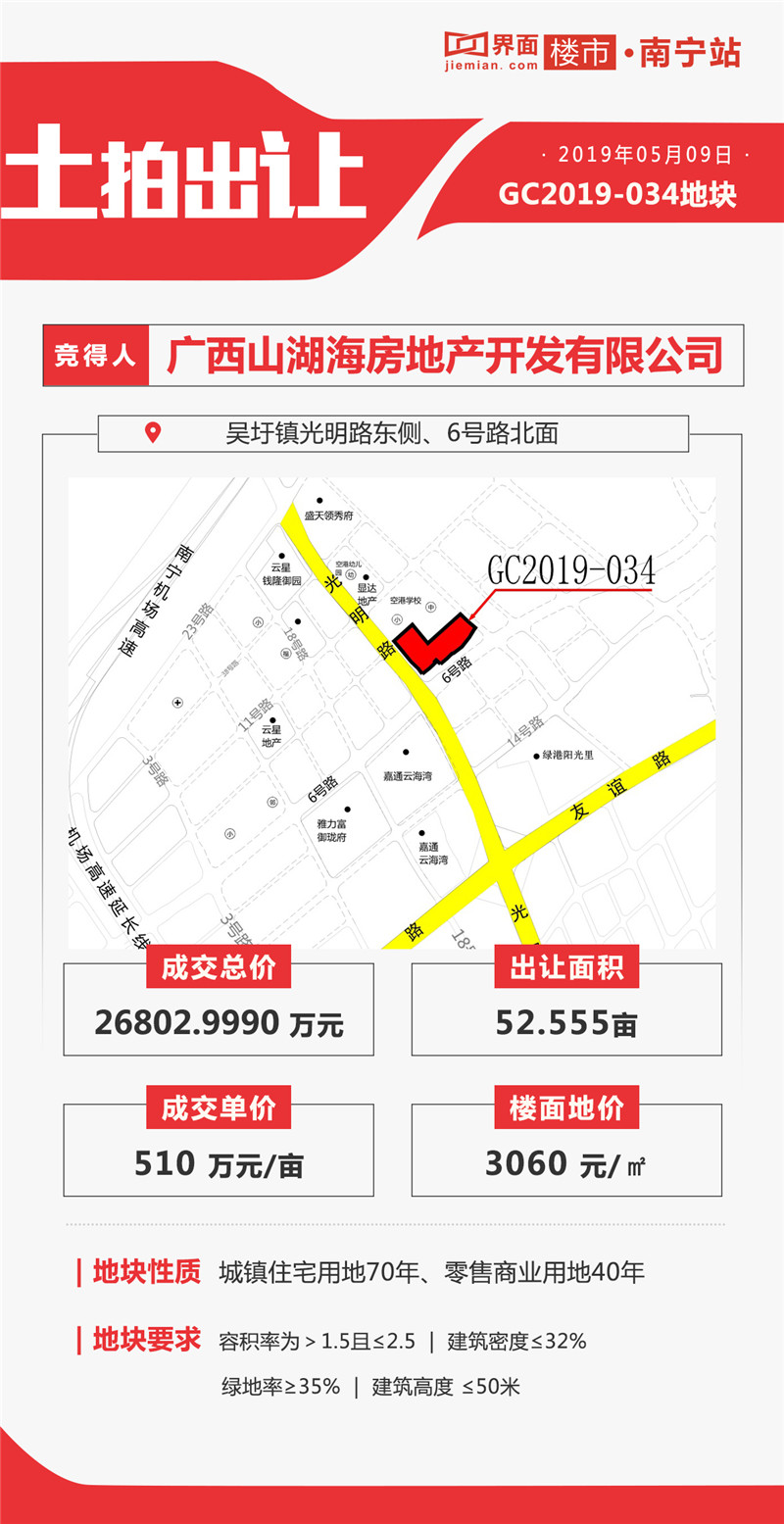当天“不限地价”GC2019-034地块开拍,吸引了山湖海、美益置业、国悦、嘉通、云星、招商、盛天、盛邦、雅力富、丰泽、海南天睿等10多家房企参与竞拍。雅力富率先报价210万/亩,随后云星、海南天睿、盛天、山湖海等房企积极举牌应价。直到雅力富报出430万元/亩后,举牌速度才稍微放缓,主持人将加价幅度调整为10万元/亩后,山湖海集团与盛天两买家紧咬不放。整场土地出让持续15分钟左右,20轮报价,最终被山湖海集团收入囊中。据悉,吴圩板块楼面地价目前最高记录,是3月14日云星集团以2190元/㎡楼面地价拍得的新地块,山湖海集团3060元/㎡的楼面价,楼面价直涨1000元/㎡,刷新吴圩板块楼面地价。