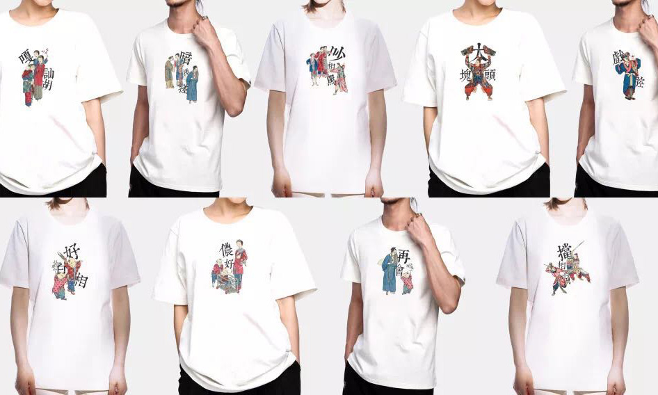 更有意思的来了!下面将为大家隆重介绍旧校场年画 T 恤。这可是上历博的Best sellers之一,图案的创作灵感运用了年画与上海话的结合,一共组成了 9 款不同的图形。他们将这九款图形采用直喷的技术运用在了纯棉 T 恤上,还原年画的年代感。黑色的上海话一目了然,既有现如今时尚穿搭必备的“标语”T恤元素,又加入了上海话所产生的共鸣感,可谓是潮中之潮。