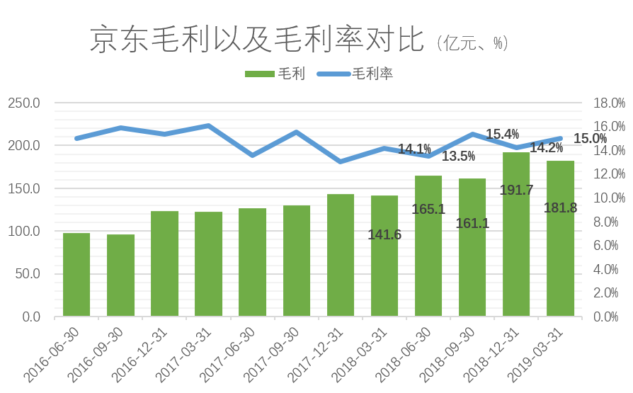 造成京东盈利的主要原因不是毛利的变化。2019Q1中,京东的毛利率为15%,较去年同期上升了0.9个bp。京东利润大增的幕后功臣,另有“其人”。