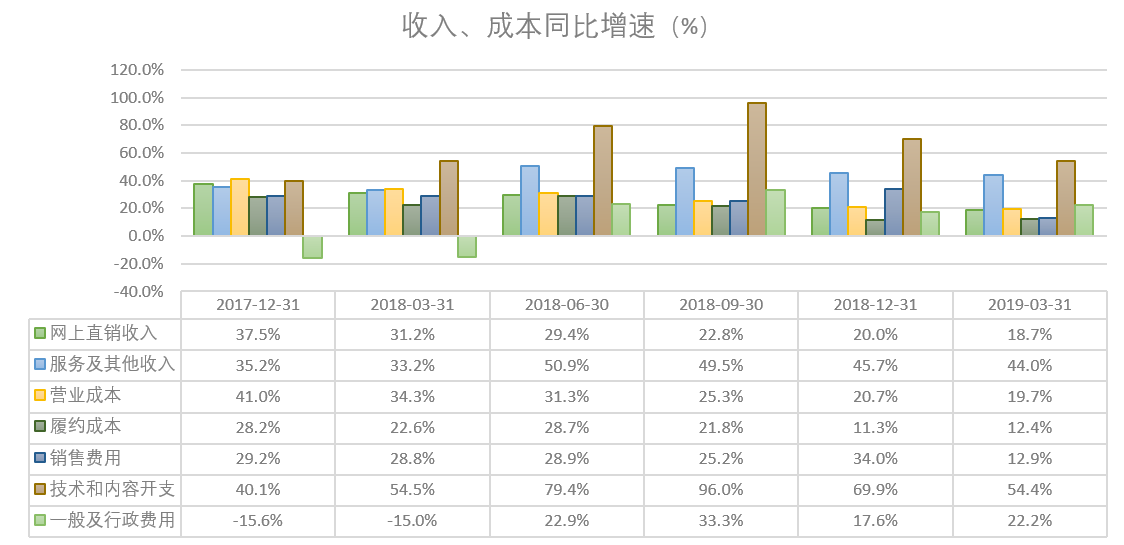京东没有进一步披露履约成本的组成,但是从2019年第一季度数据来看,其占总收入的比例进一步下降到了6.7%。需要留意的是,各项成本中,履约成本是增速最慢的一项成本,同比增速仅为12%,就连主营成本(卖货的成本)的增速都有20%。可以看出,京东对于物流板块的成本有所管控。