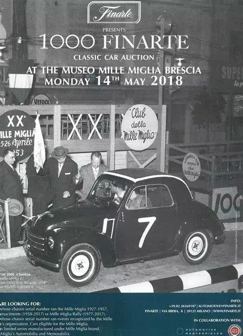 去年5月,意大利Finarte拍卖行举行了第一场Mille Miglia专场汽车拍卖会“1000 Finarte”。今年,Finarte汽车部门将于5月13日在Mille Miglia博物馆举办第二次专场汽车拍卖会,日期安排在一千英里拉力赛的前一天。