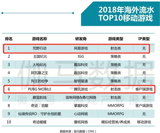 而且,《刺激战场》最大的竞争对手《荒野行动》在海外开辟了新的市场。2018年5月,网易旗下《荒野行动》国际版首次登顶中国手游出海收入榜,成为了最赚钱的出海“吃鸡”手游,尤其是在日本市场。日本游戏玩家一向对国外游戏不甚友好,作为任天堂、索尼两大游戏巨头的大本营,和独有的游戏文化环境、游戏市场环境令他国游戏厂商难以染指。而网易的《荒野行动》出海五个月后赚到的25.6亿收入,近74%来自于日本。经过统计,2018年海外移动游戏流动资金排名中,《荒野行动》稳占鳌头,而《刺激战场》海外版(《PUBGMOBILE》)则位列第六名。