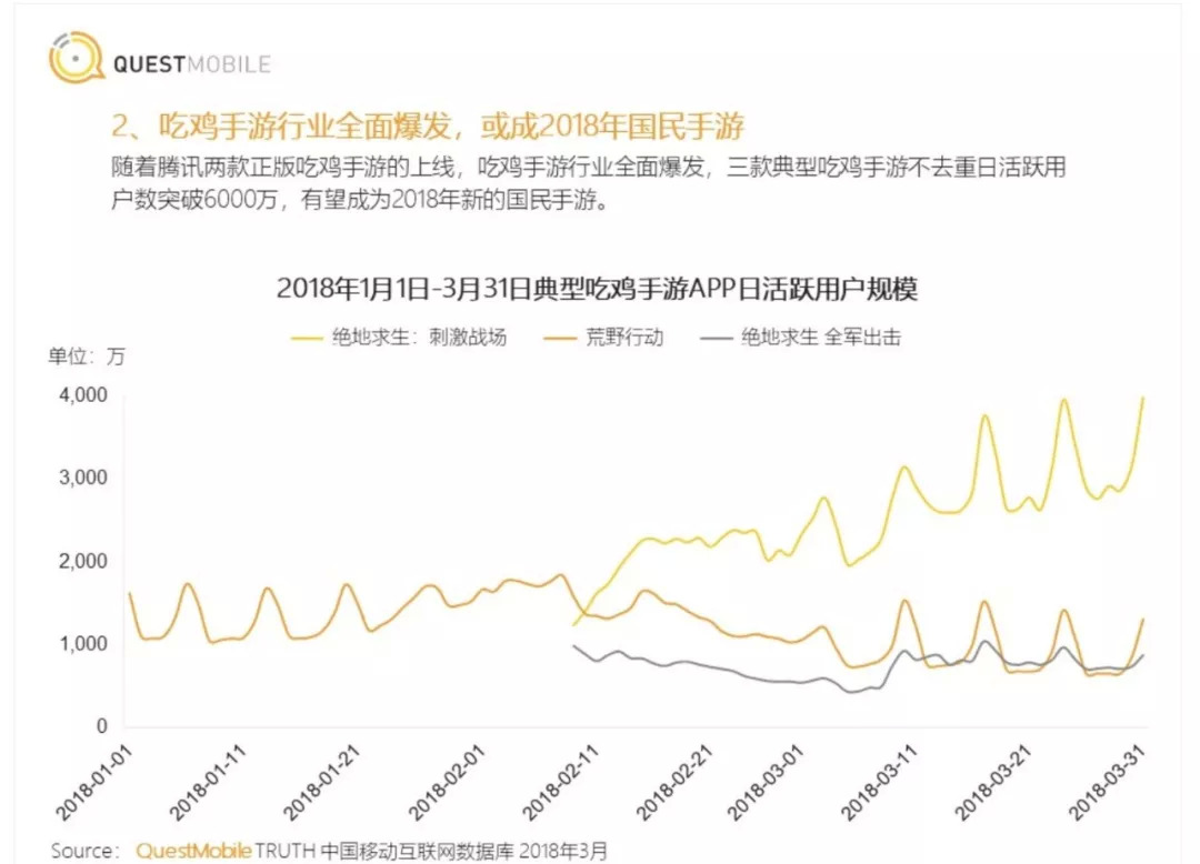 其中以网易的《荒野行动》最为成功。2017年12月的数据监测显示,当时每天活跃在《荒野行动》游戏的玩家将近2304万人,全国大概有5.5%的手机上安装了《荒野行动》,排在它前面的分别是《王者荣耀》《开心消消乐》和《欢乐斗地主》,即使这样,当时每天依然有166万用户涌入《荒野行动》之中。而同样是网易旗下的《终结者2:审判日》,虽然披着《终结者》IP光环,也没能获得更多青睐,至于《小米枪战》就更落寞了。