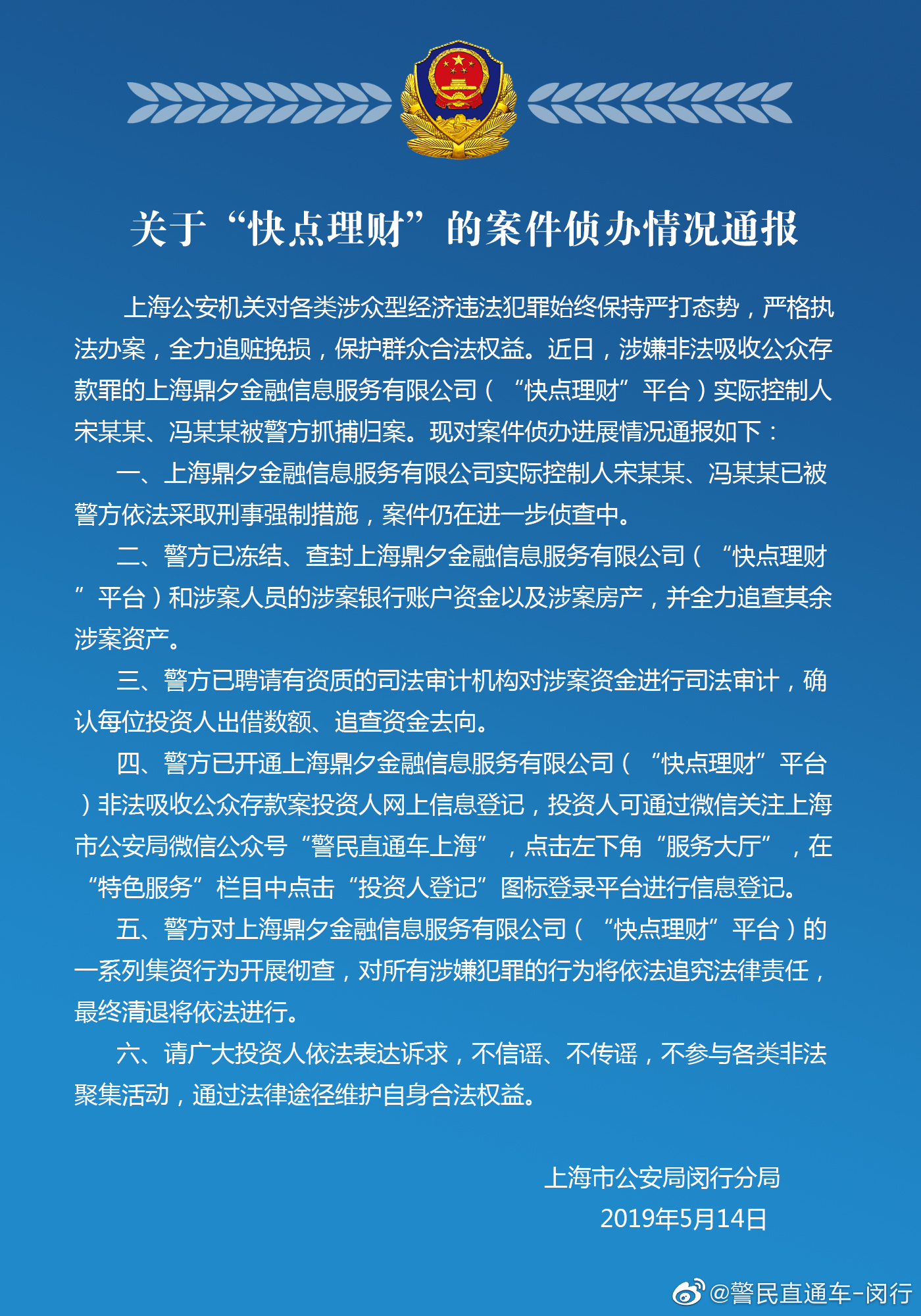 上海警方通报“快点理财”案件侦办:两控股人归案,冻结资金。