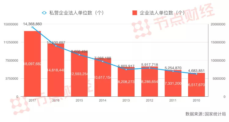 从国家统计局公布出的信息来看,直到2013年之前,中国的企业法人数量增长缓慢,甚至出现了下降趋势,但是进入2014年,中国企业法人数量开始迅速增长,并且从曲线斜率来看,增速还在逐年提高。