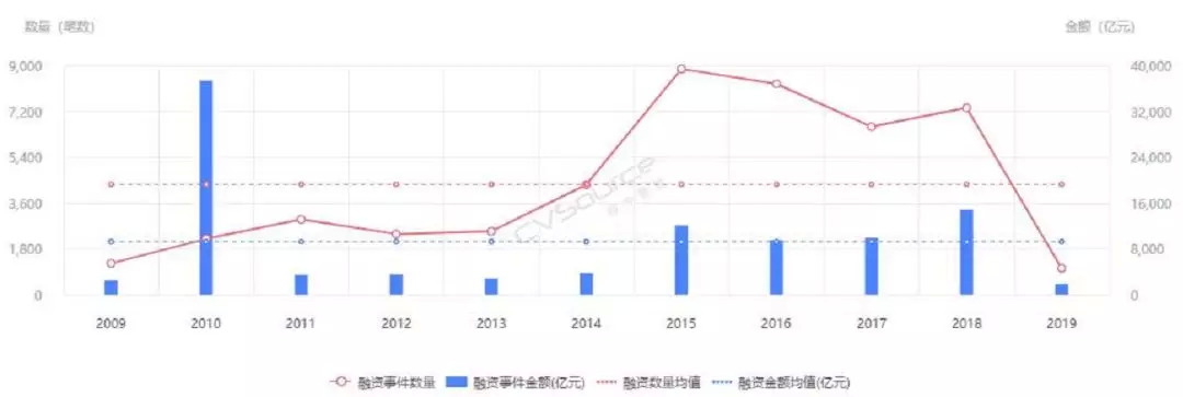 2013年开始,中国投融资事件的数量和总规模逐步提升,到2015年达到峰值,2016年之后开始下降(数据来源:投中数据)。