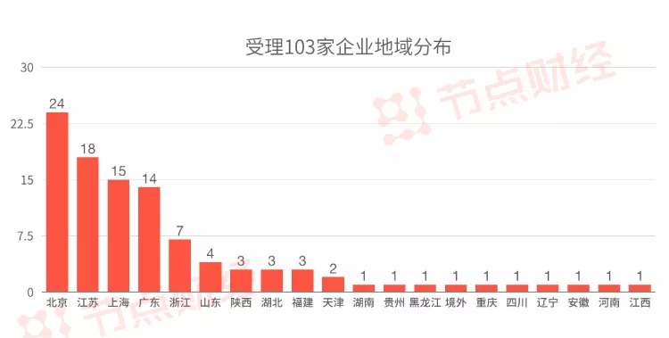受理的103家企业中,有24家企业来自北京,江苏有18家,上海有15家,广东有14家,其中包括深圳8家,广州2家,梅州2家。