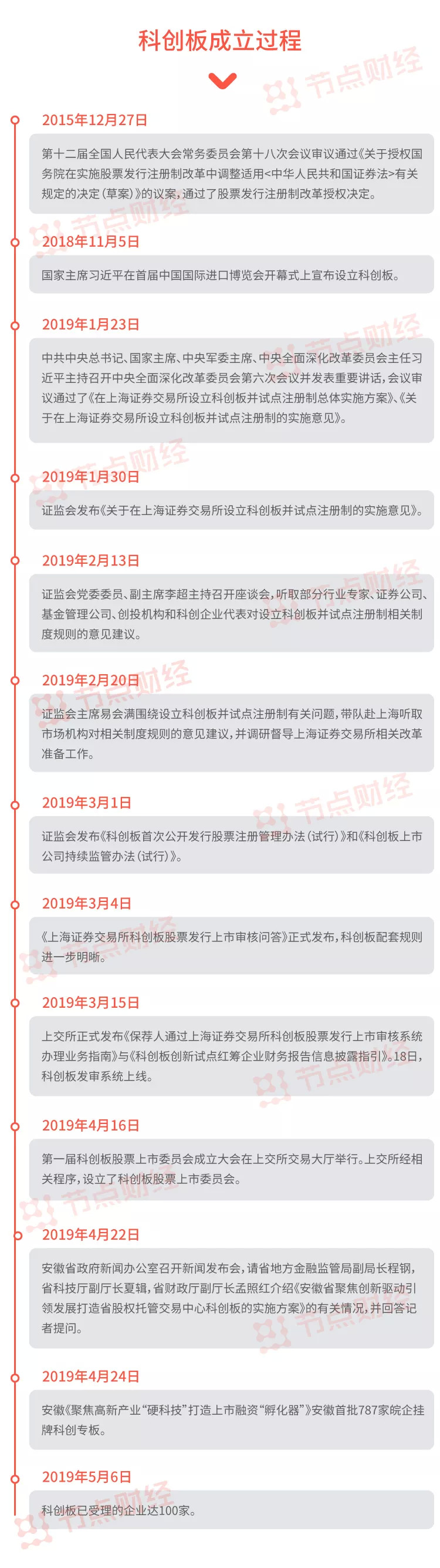 2018年11月15日,首届中国国际进口博览会开幕式上正式宣布设立科创板。次年3月,上交所科创板法审系统上线,4月科创板股票上市委员会成立,截止到5月6日,科创板已受理企业突破100家。